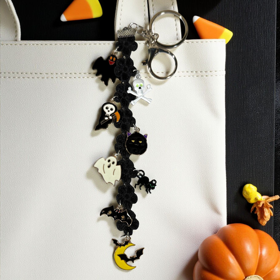 Halloween Charm Handmade Bag Charm Keychain Black & White Charms on Black Lace