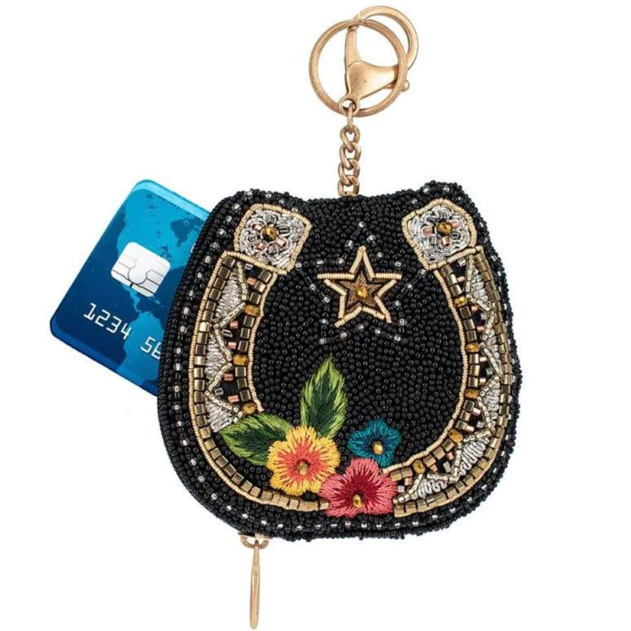 Meet your new lucky charm! This beaded coin purse with key fob clap is a perfect combination of convenience and flair. Keep this beaded horseshoe with its bright embroidered accents easily at your side.