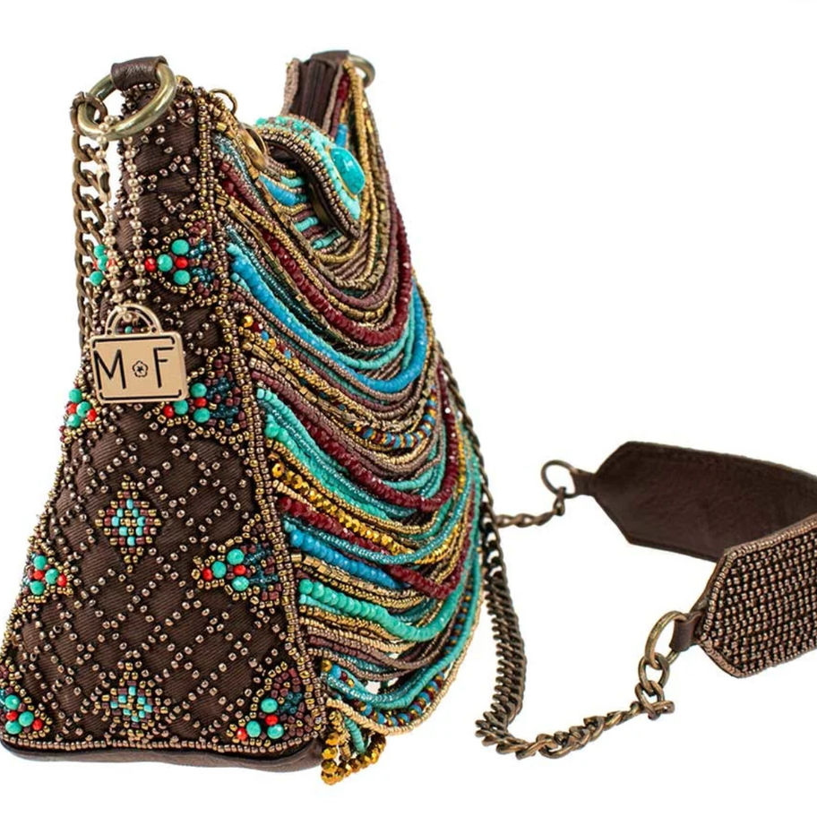 Strand after strand of beads in tones of turquoise, garnet, bronze & gold drape across the front of this crossbody handbag creating a fun boho feel that makes a bold fashion statement. It's roomy interior, padded shoulder strap and secure zipper and magnet flap closure make it the perfect companion for festival outings or everyday adventures.